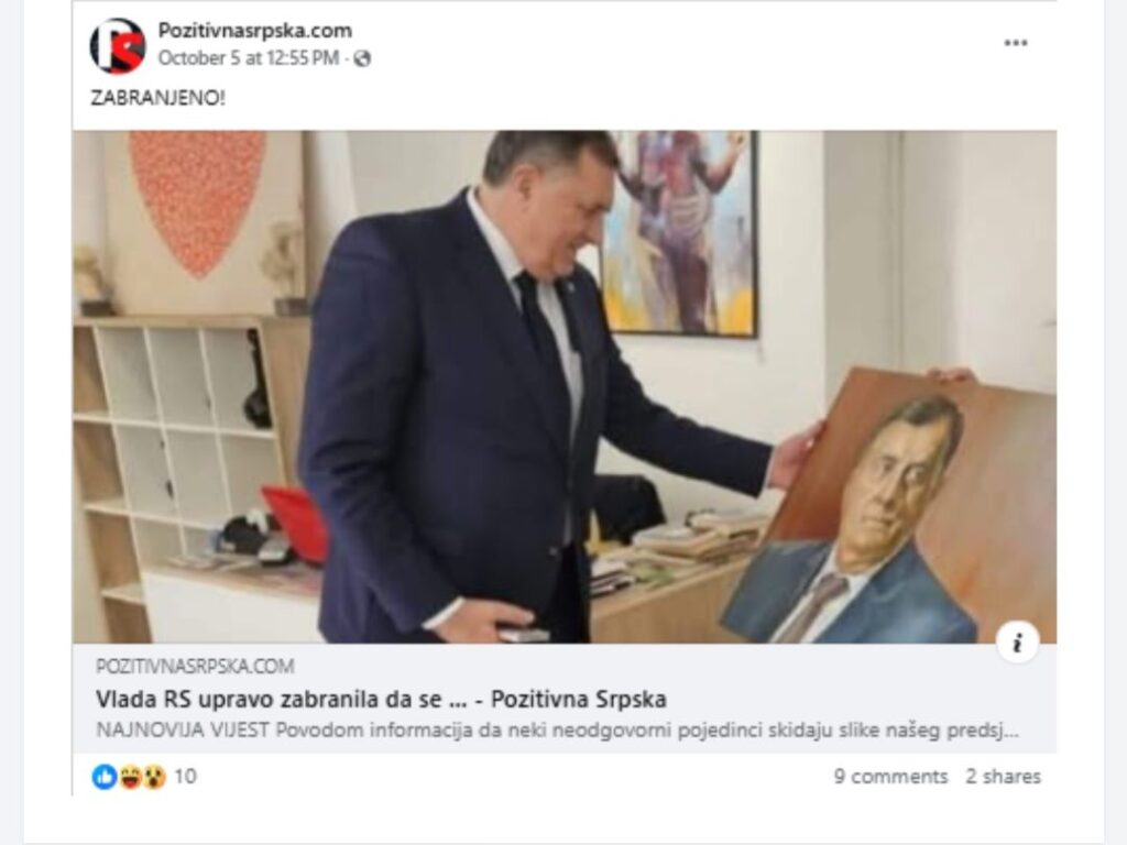 Na portalu Pozitivna Srpska je 5. oktobra 2025. godine objavljen članak u kojem se navodi da je Vlada Republike Srpske (RS) zabranila skidanje slika Milorada Dodika u javnim institucijama. U članku je citirano navodno saopštenje Vlade RS.